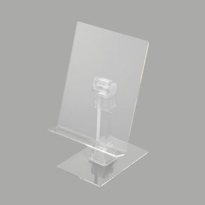 テーブルの角度が15度ずつに調節できる透明展示台です。見やすい角度で展示できます。