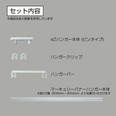 【入数】1セット【セット内容】eZハンガー本体(ピンタイプ)1個、マーキュリーバナーハンガー本体1個、ハンガーバー1個、ハンガークリップ2個、取扱説明書1部 ※紐は付属していません 【サイズ】マーキュリーバナーハンガー(ポスターハンガー)は2種からお選びいただけます。 ・600mm ・900mm 【仕様】・開閉式 約1mm厚の紙、ビニール、布などを挟むことができます
