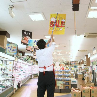 ポスターの差し替え機能付きの天吊りパーツ・eZハンガー(ピンタイプ)&ポスターハンガーのセットです!天井に取付けたパーツにハンガーを引っ掛けることで、高い位置のポスターをワンタッチで交換できます。 ポスターハンガーは開閉式で差し替え簡単。1mm厚までの紙、布、ビニールなどをしっかり固定し挟み込みます。 ハンガーバーとハンガークリップは、ポスターハンガー本体の横からスライドして着脱可能。紐でライナーと結ぶことで、吊下げの長さ調整も可能です。 売り場の案内、大きなPOPの吊り下げ、イベント掲示などにおすすめです。 ※紐は別売りです ※交換には別売りの専用ハンガーポールが便利です。(商品番号 18561)※納期の確認が必要です。