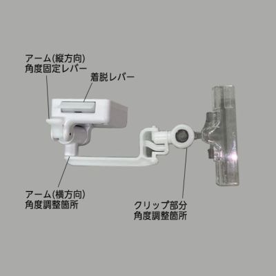 強力マグネット付きカテゴリークリップです。ゴンドラ下に磁石で取付、POPをクリップに挟むだけで簡単にご使用いただけます。クリップ部分がバネのような仕様になっているのが特徴で、突き出し部分が通行時に当たってもズレにくく、安全な作りになっています。 クリップ部分は縦方向に9段階、アーム部分は横方向は360度8段階、アーム縦方向の調整箇所はレバー式で角度調整ができます。また磁石部分は着脱レバー付です。 角度は3箇所で調整可能。そのためお好みの方面へPOP掲示がしやすく、汎用性が高く様々な場所でご使用いただけます。