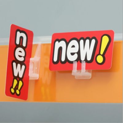プライスホルダーやこぼれ止めに差し込むだけ、フック式の2WAYサインホルダーです。 POPは1mm程度の厚さのものまで使用可能です。差しやすく取れにくい使用で、縦差し・横差しどちらでも使用できる2WAYです。正面だけでなく横面への訴求が可能なため、幅広い用途でご活用いただけます。