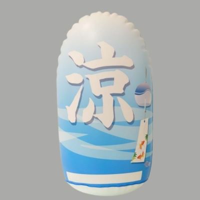 【入数】1個【サイズ】大・小の2種からお選びいただけます。膨らまし前:(大)約150×300㎜ (小)約120×235㎜膨らまし後:(大)約155×305㎜ (小)約125×240㎜※左の写真は(大)です。 【材質】軟質塩ビ 【絵柄】涼 【その他】●底面に砂鉄です。 ●両面同柄インクジェット印刷です。 ●膨らまし用のポンプは別売りです。 ●別途名入れすることも可能です。 ※名入れするの場合のご注意 名入れスペースに文字(1色)が入れられます。 入れる文字とフォントと色をご指定下さい。 また、データご支給でロゴを入れることも可能です。その場合、データはaiデータ・解像度150dpi以上に限ります。