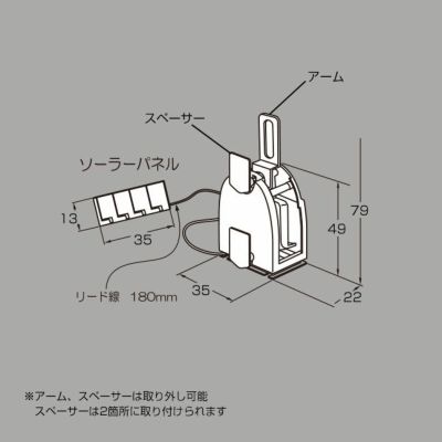 【入数】1セット 【サイズ】本体部分: W35×D22×H49mm (アーム付H79mm) ソーラー部分: W35×D1×H13.5mm コード寸法:170mm 【仕様】本体重量:200g (ソーラーパネル重量含まず) 使用温度範囲:0℃~80℃ 【材質】耐熱ABS樹脂 【注意点】・水平を保った状態でご使用下さい ・スチール等から本体を10㎜以上離してご使用下さい。動かない等、動きに影響が出る場合がございます。詳細は取説内の「ご注意」にてご確認ください。