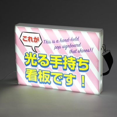 暗い場所でも光って目立つ!LED仕様で光るA3サイズの手持ち看板です。 夜間の呼び込み・案内など、暗いシーンでの使用に大活躍。用意した印刷物を挟み込み、モバイルバッテリーからの給電で気軽にお使いいただけます。ストラップ付で首からかけることも出来ます。 ※納期の確認が必要です。